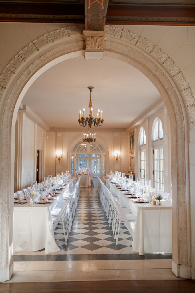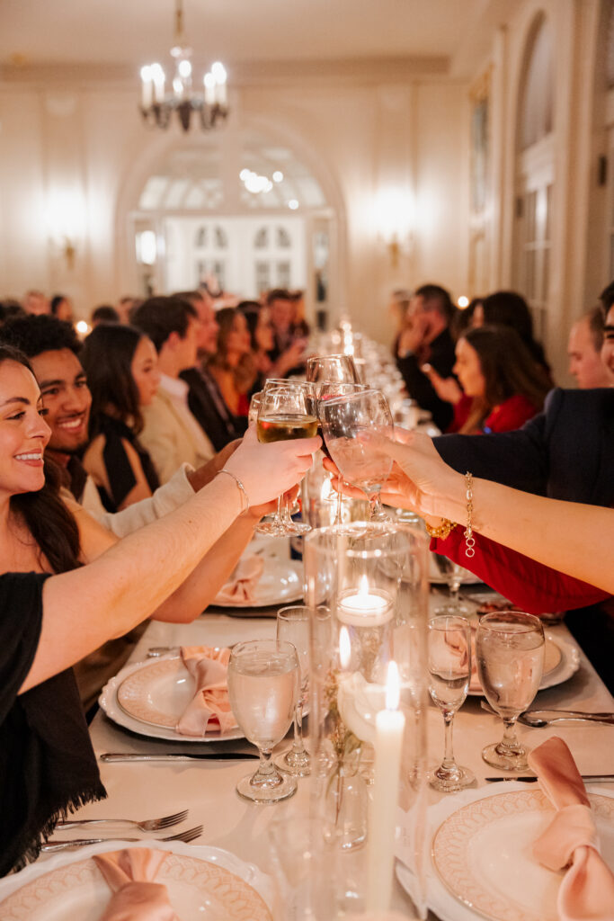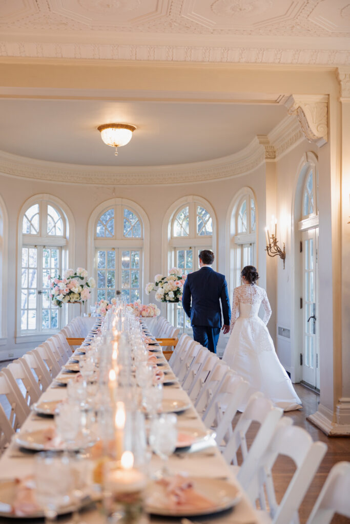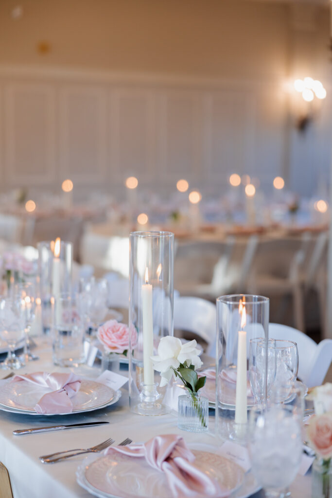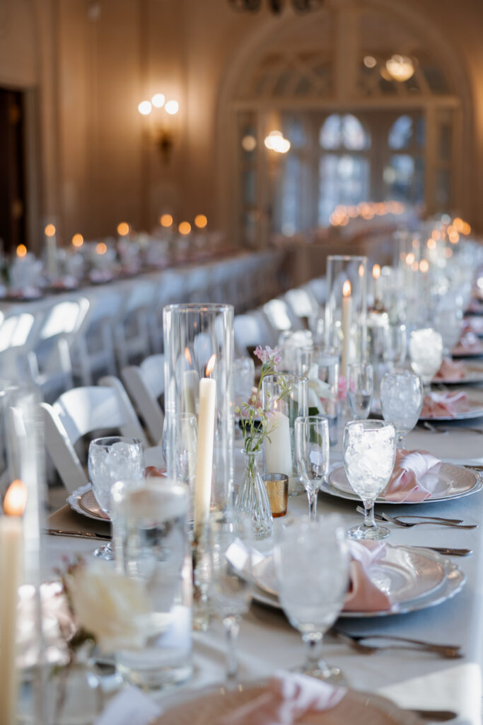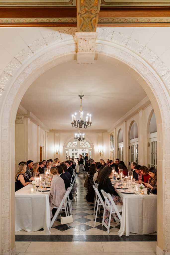 From there, the celebration moved to the Mansion at Woodward Park, a venue known for its architectural beauty and refined charm. Constructed with a dreamy blend of Italian Renaissance and Art Deco design, the Mansion retains its vintage character while feeling bright, spacious, and effortlessly elevated. It was the perfect backdrop for a winter reception designed to feel romantic without being understated. Inside, the room was transformed into a candlelit dinner experience on a grand scale. Long tables stretched through the space, lined with glowing candles and soft pink florals, creating warmth against the cold winter evening outside. The flicker of candlelight reflected off the historic details of the room, setting the tone for a reception that felt classic and intentional.