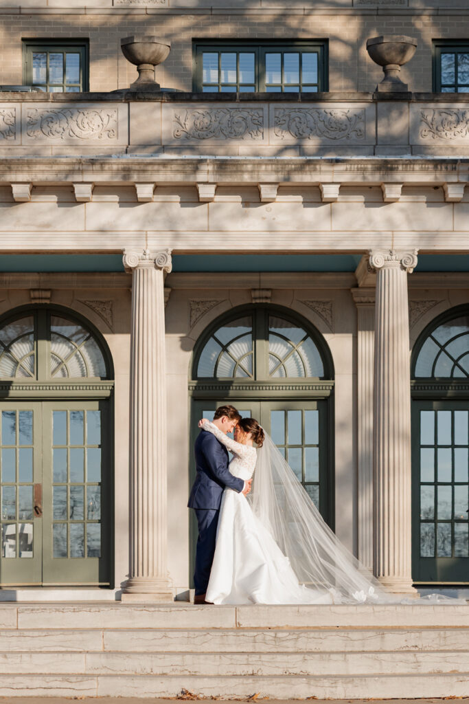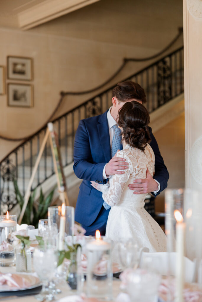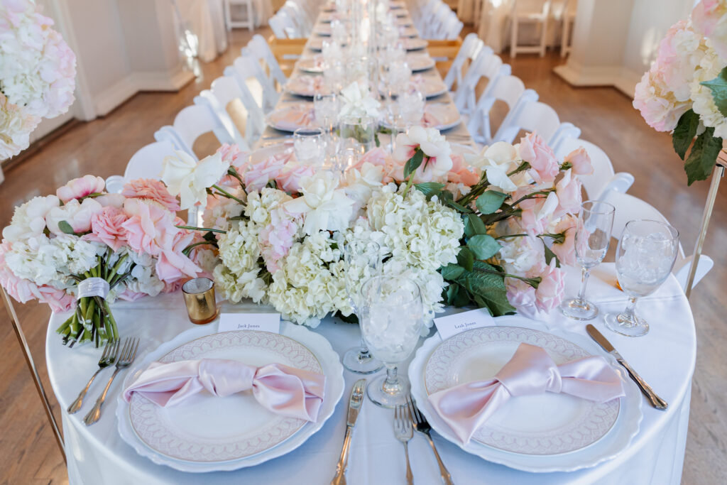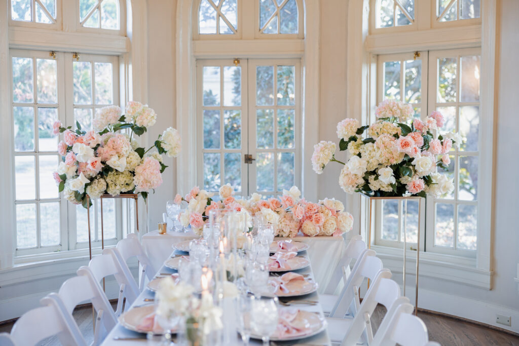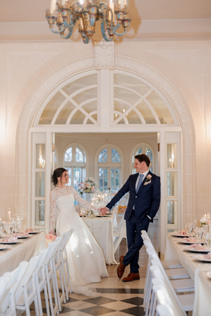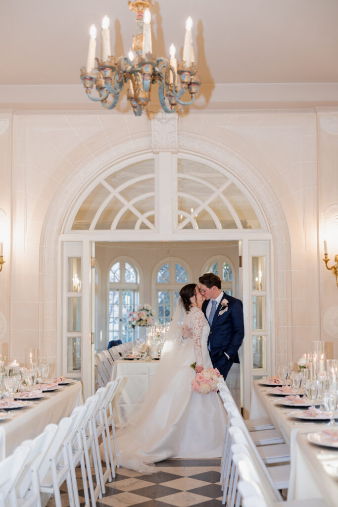 From there, the celebration moved to the Mansion at Woodward Park, a venue known for its architectural beauty and refined charm. Constructed with a dreamy blend of Italian Renaissance and Art Deco design, the Mansion retains its vintage character while feeling bright, spacious, and effortlessly elevated. It was the perfect backdrop for a winter reception designed to feel romantic without being understated. Inside, the room was transformed into a candlelit dinner experience on a grand scale. Long tables stretched through the space, lined with glowing candles and soft pink florals, creating warmth against the cold winter evening outside. The flicker of candlelight reflected off the historic details of the room, setting the tone for a reception that felt classic and intentional.
